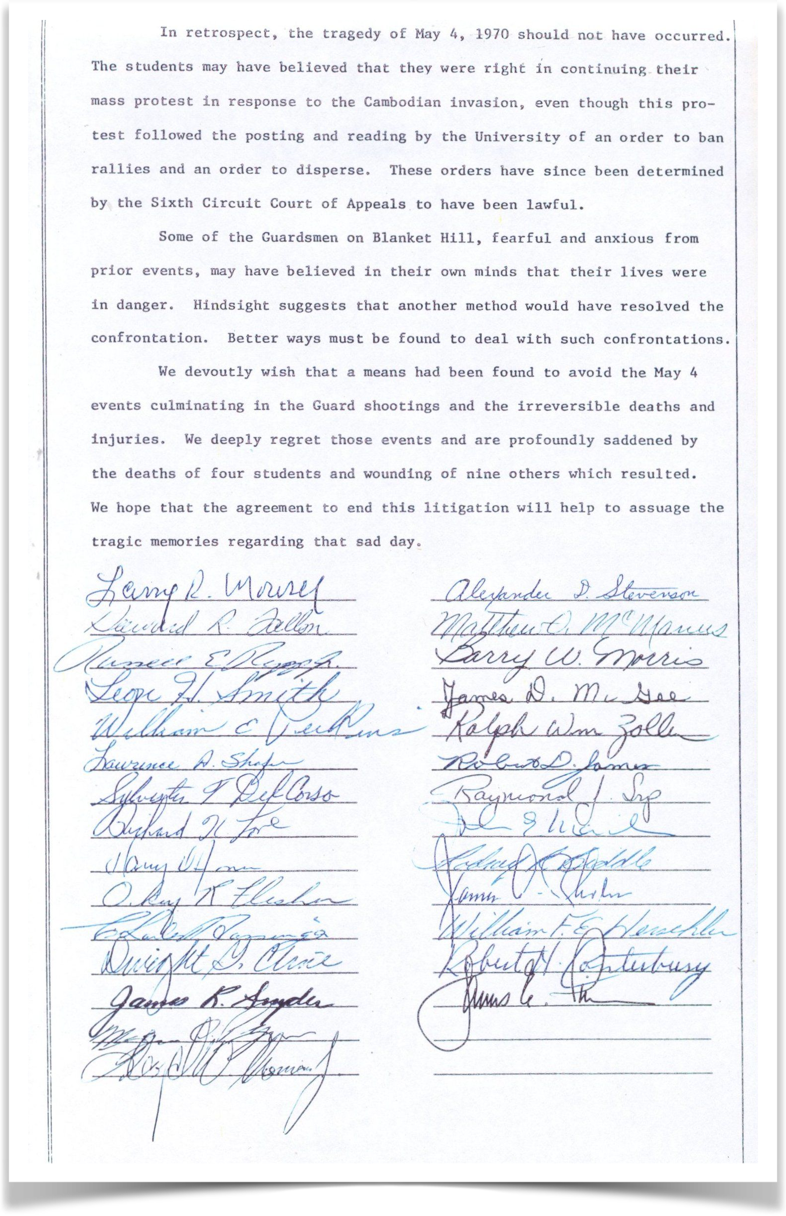 Read the Kent State Settlement Statement signed by all harmed in the Kent State massacre.