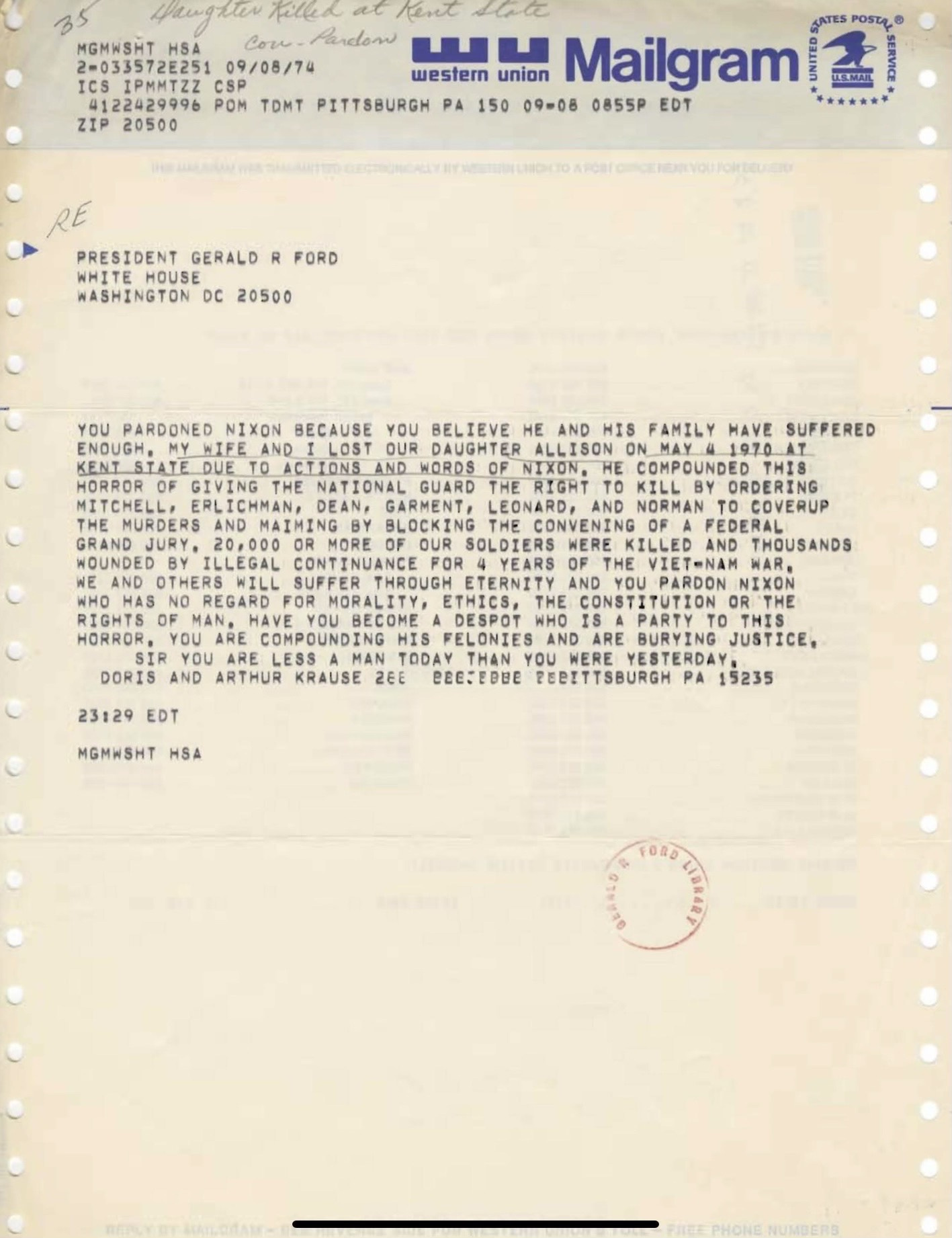 To conclude Nixon’s deal, on September 8, 1974 President Gerald Ford awarded Nixon a full pardon. READ Dad’s response to Nixon’s pardon in this telegram signed by my parents and sent to the President Gerald Ford in the White House: